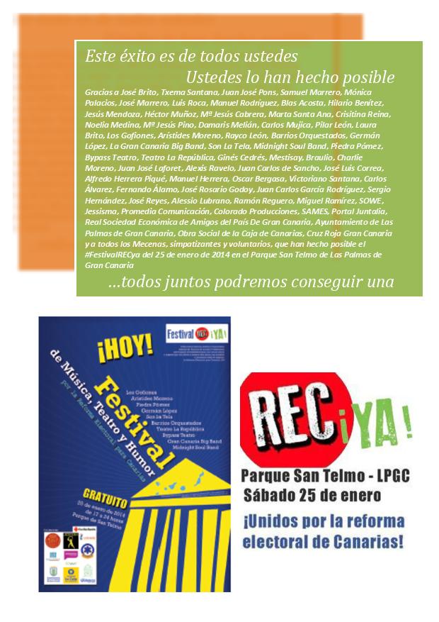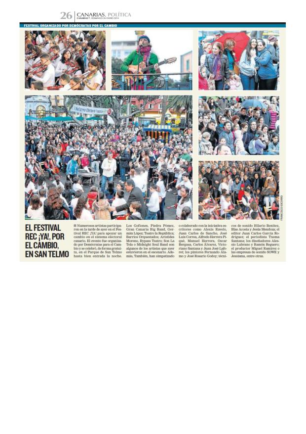 A continuación presentamos algunos recortes de prensa que hacen mención al Festival REC ¡YA! celebrado el pasado 25 de enero de 2014 en el Parque San Telmo de Las Palmas de Gran Canaria.