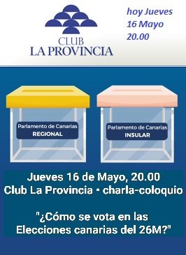 Esta tarde a 20.00, Demócratas para el Cambio y el profesor Gerardo Pérez de Derecho Constitucional de la ULL, estaremos en el Club La Provincia (c/ León y Castillo 39) para explicar el nuevo sistema de votación al Parlamento de Canarias que tendrá 2 papeletas y 2 urnas, una novedad en toda España.
